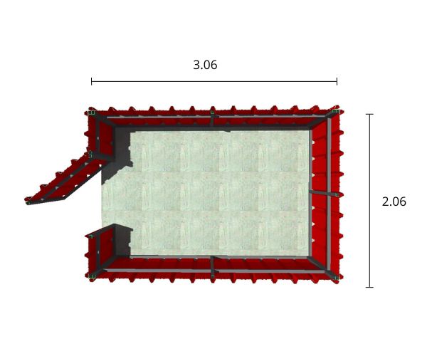 Vista superior del galpón, cuyas dimensiones totales son de 3,06mts x 2,06mts. Cualquier tipo de características del galpón pueden ser modificadas según necesidades del usuario.