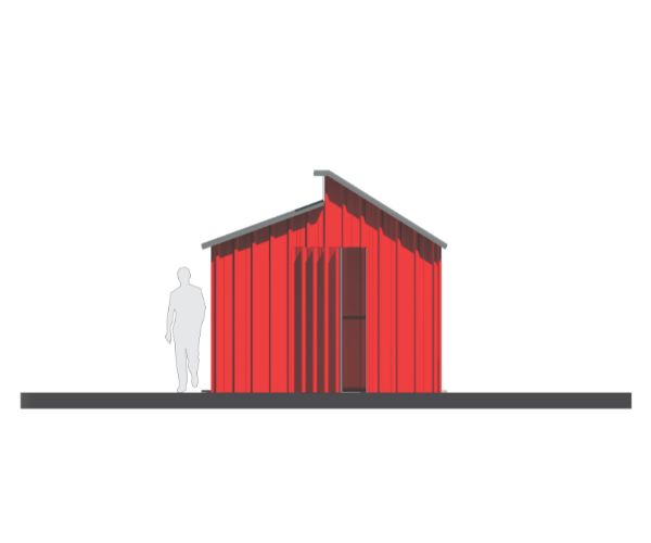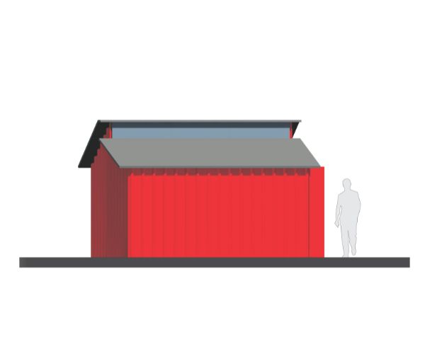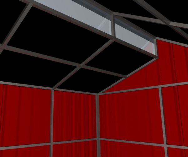 Corte interior en donde se puede apreciar los detalles estructurales (perfiles de hierro galvanizado), cerramientos laterales de chapa trapezoidal calibre 26 al igual que la cubierta superior. La composición de la cubierta puede ser modificada según requerimientos solicitados